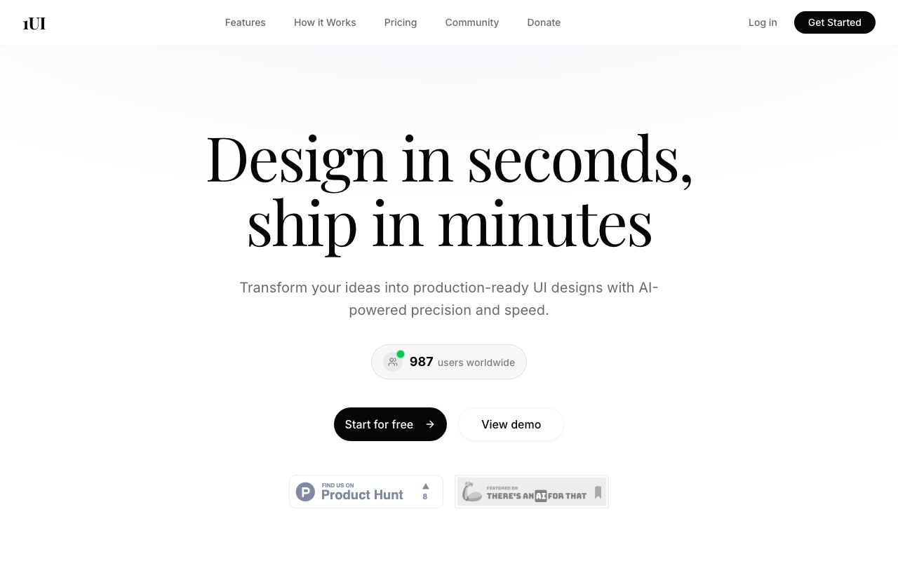 1UI es una plataforma de generación de interfaces con IA pensada para crear diseños de UI rápidos, limpios y listos para iterar. Su enfoque combina automatización avanzada con exportación útil para flujos reales de producto, incluyendo Figma, HTML y CSS.