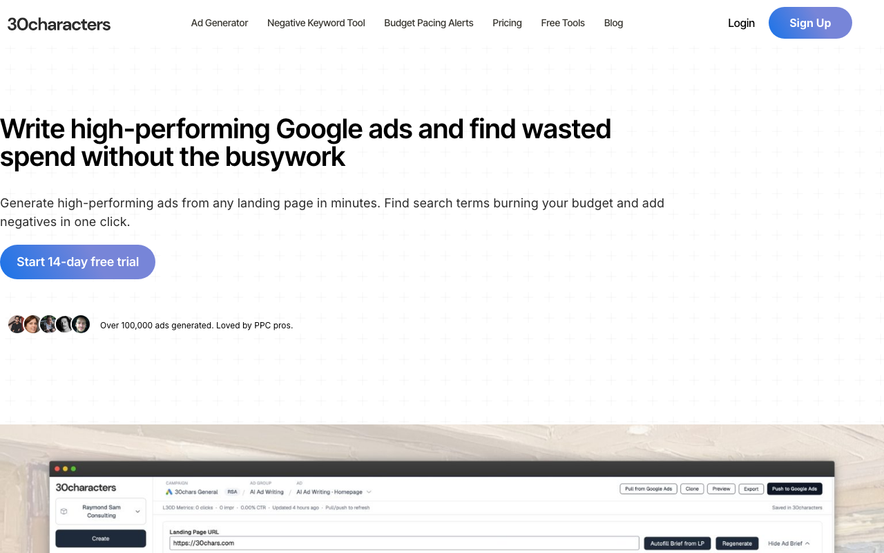 30characters es una plataforma de IA enfocada en Google Ads que ayuda a crear anuncios de búsqueda más rápido y a detectar gasto desperdiciado en campañas. Está pensada para equipos de marketing que necesitan producir copys efectivos sin perder tiempo en tareas repetitivas.