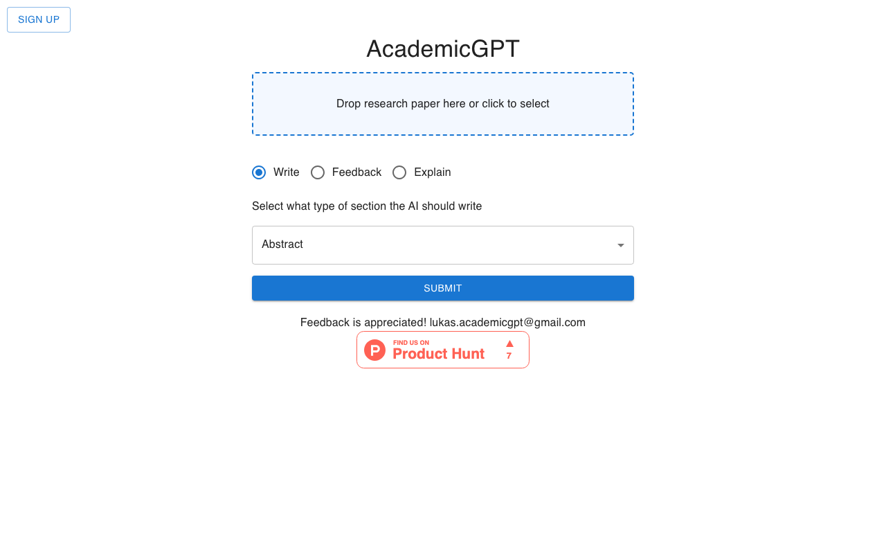 AcademicGPT es una suite de herramientas de inteligencia artificial diseñada para asistir en la creación de artículos académicos. Permite a los usuarios subir el estado actual de su artículo en formato PDF y utiliza algoritmos de IA para generar resúmenes y abstractos, simplificando el proceso de escritura.