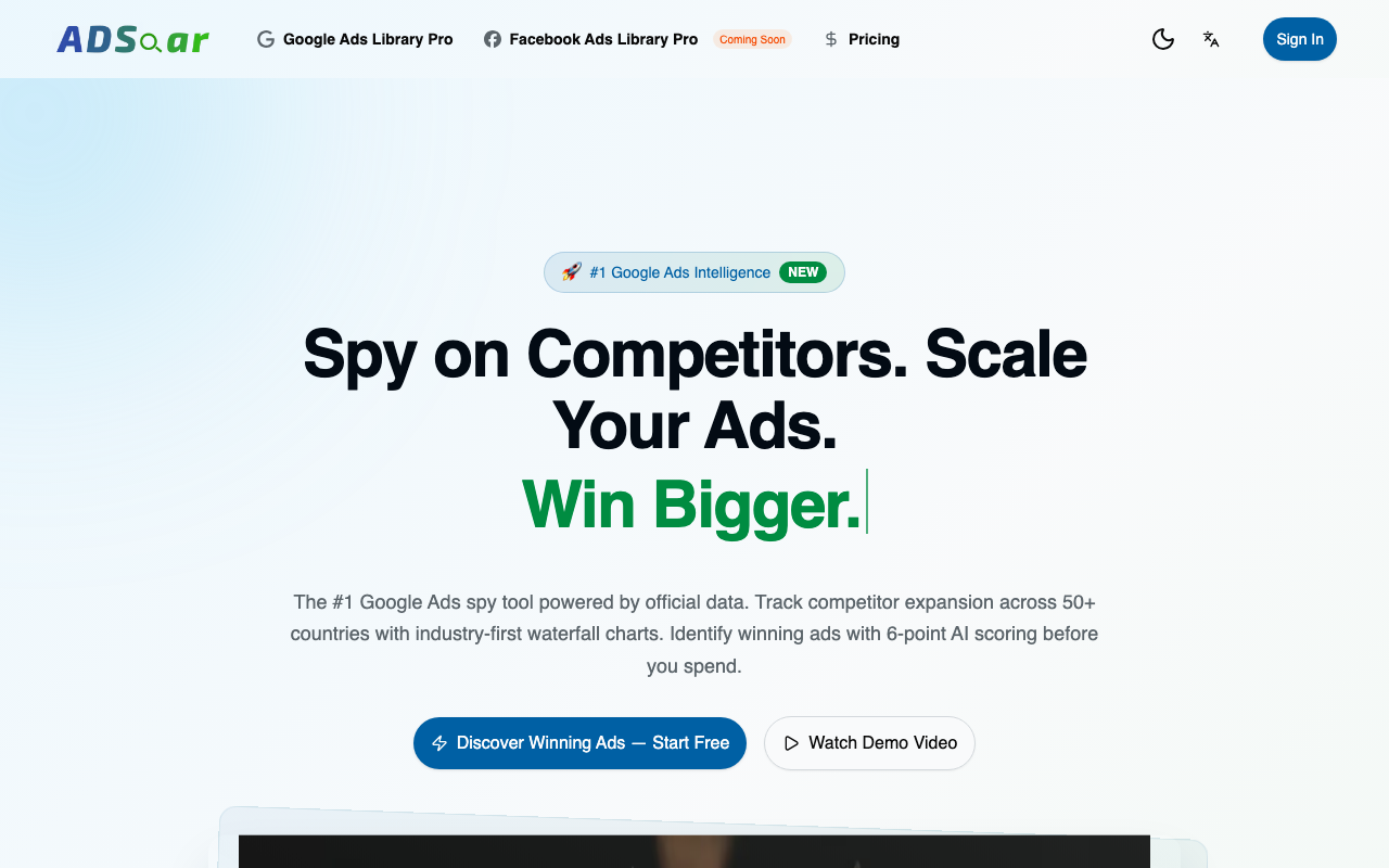ADSoar es una herramienta de inteligencia de Google Ads que utiliza inteligencia artificial para ayudar a los usuarios a monitorear la expansión de sus competidores, escalar sus propios anuncios y ganar en sus esfuerzos publicitarios. Esta herramienta está diseñada para mejorar el planificación estratégica y proporciona a los investigadores de mercado la capacidad de rastrear la expansión de los competidores en múltiples países.
