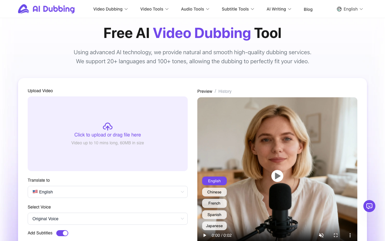 AI Dubbing.io es una plataforma que utiliza IA para generar audios de doblaje de alta calidad y traducir videos a múltiples idiomas con sincronización labial precisa.