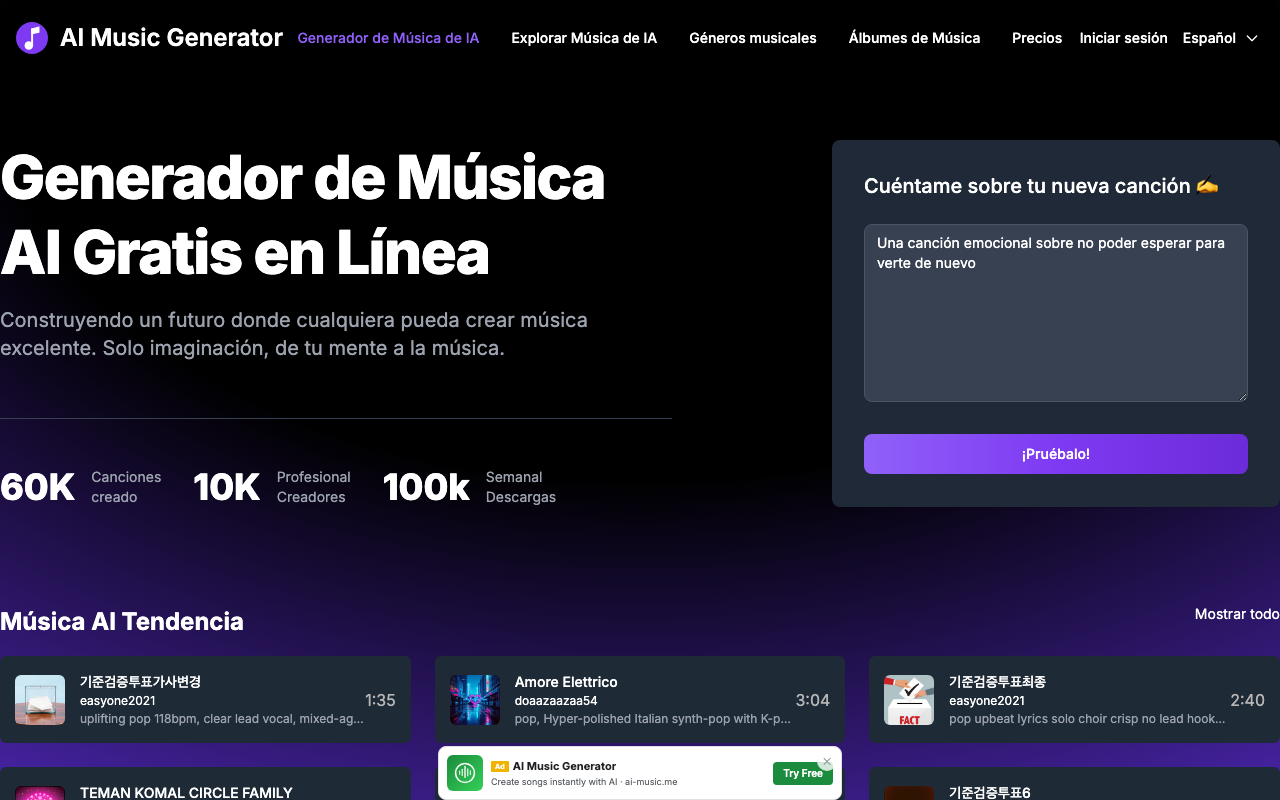 AI Music Generator permite generar música original con inteligencia artificial a partir de una idea, un estilo o una descripción breve. Está pensado para producir canciones en distintos géneros, con opciones de personalización y descarga en MP3.