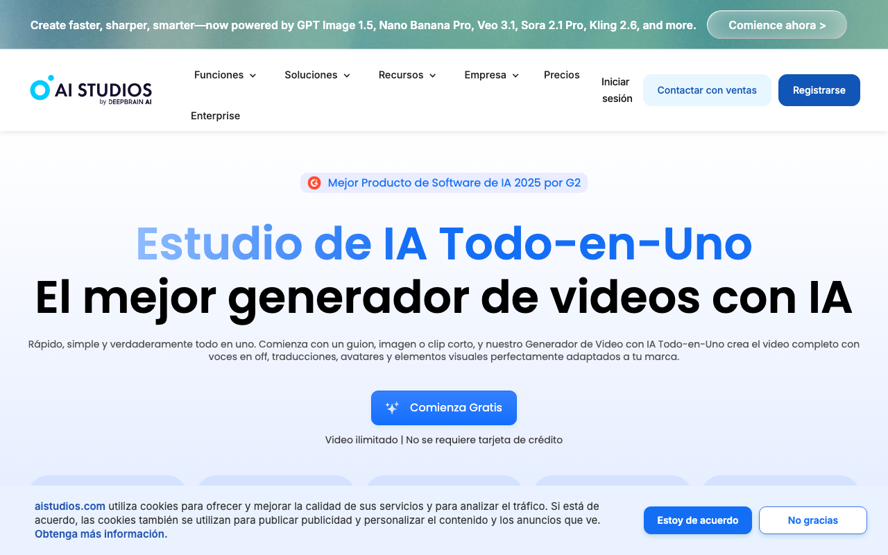 AI Studios, de DeepBrain, es una plataforma enfocada en generar videos a partir de texto con un flujo bastante directo: conviertes ideas, artículos o materiales en guiones visuales y obtienes piezas listas para publicar. Su propuesta destaca por combinar generador de video, avatares (incluye opciones listas para usar y creación de avatar personalizado) y automatizaciones como doblaje y subtitulado.