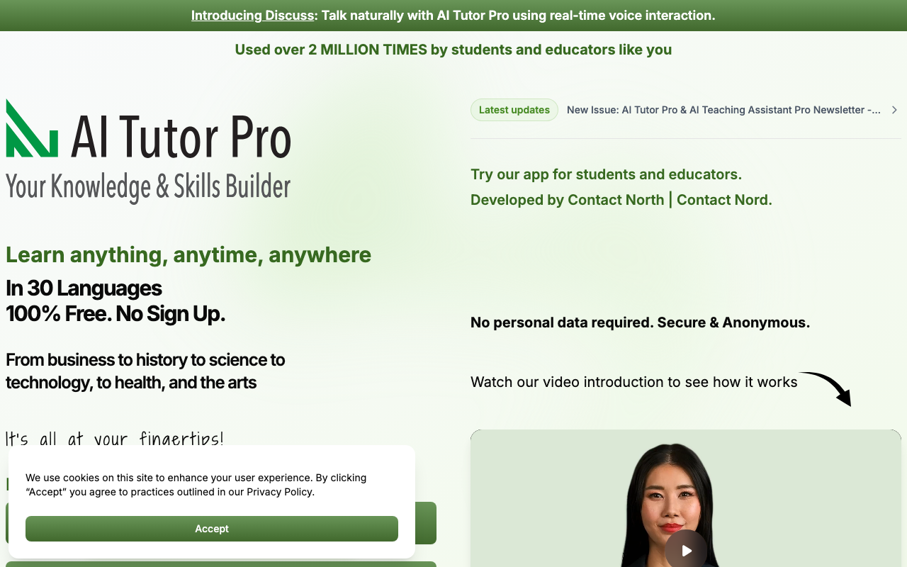 AI Tutor Pro es un asistente digital impulsado por inteligencia artificial creado por Contact North | Contact Nord. Está pensado para ayudar a aprender, repasar y ampliar conocimientos en una amplia variedad de temas, con acceso gratuito, sin registro y con enfoque en privacidad.