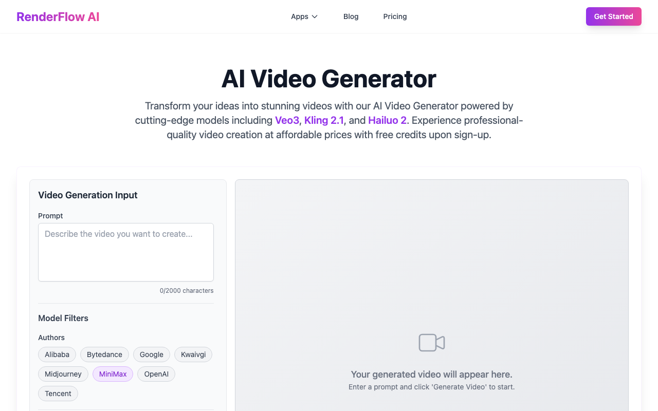 RenderFlow AI Video Generator es una plataforma online para crear videos con IA a partir de descripciones en lenguaje natural. En lugar de partir de un guion técnico, escribes un prompt, eliges el modelo y ajustas parámetros para obtener el estilo y el resultado que buscas. Si necesitas más control visual, también puedes subir imágenes de referencia para guiar la composición y los detalles del video.