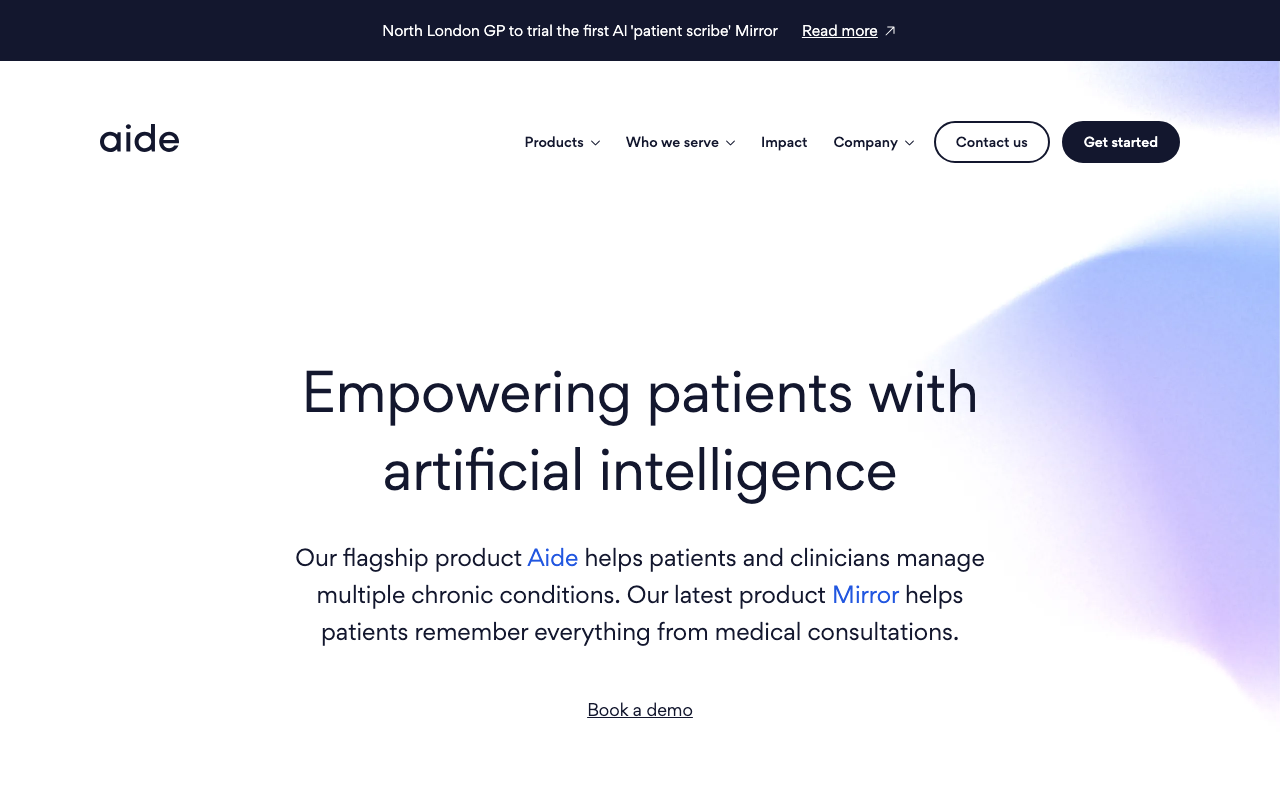 Aide Health es una empresa de salud digital que desarrolla herramientas basadas en IA para ayudar a los pacientes a gestionar su salud y sus condiciones crónicas, y a los profesionales de la salud a proporcionar un cuidado personalizado y eficiente. Sus dos productos principales son Aide y Mirror.