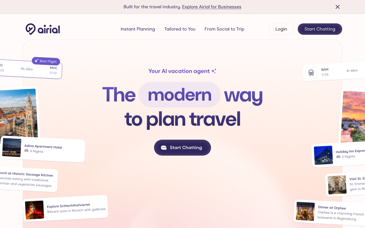 Airial es un planificador de viajes con IA que actúa como un asistente personal para organizar itinerarios y ayudar a reservar vuelos. En lugar de llenar formularios largos o abrir decenas de pestañas, puedes describir tu viaje y recibir una propuesta hecha a medida.