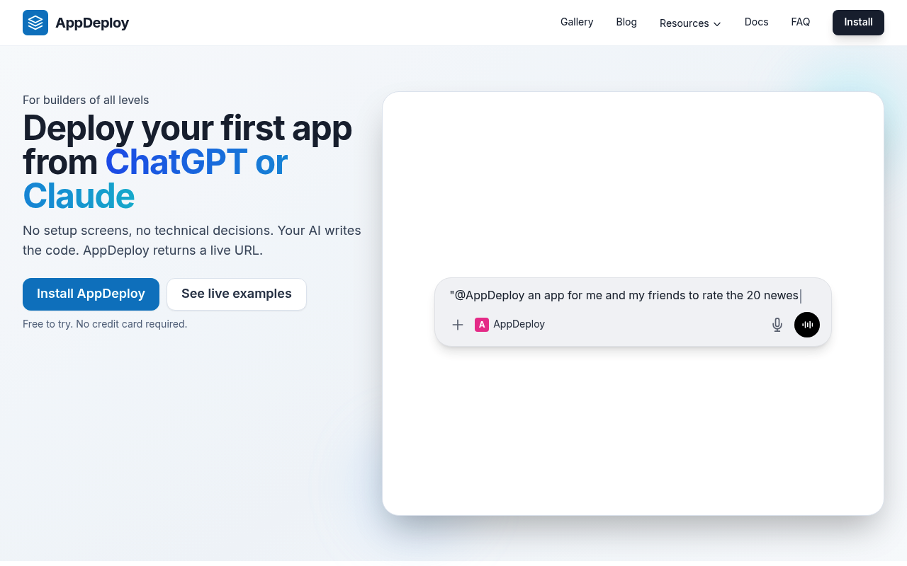 AppDeploy es una plataforma innovadora diseñada para facilitar el despliegue de aplicaciones utilizando inteligencia artificial. Esta herramienta es ideal para desarrolladores y empresas que buscan simplificar el proceso de implementación de sus aplicaciones sin incurrir en costos adicionales.