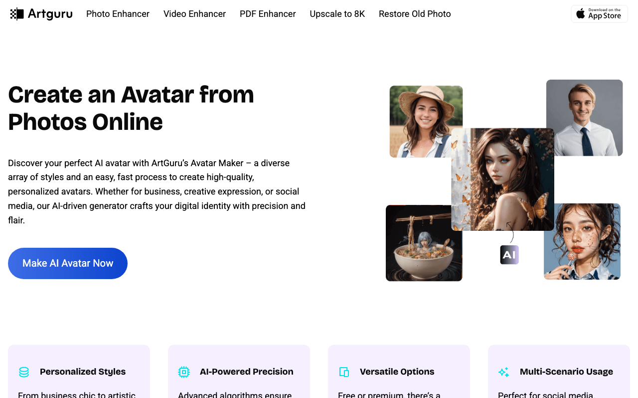 Artguru es un generador de avatares con IA que transforma fotos en retratos digitales con acabado realista, artístico o temático. Está pensado para crear imágenes de perfil más llamativas sin necesidad de saber editar.