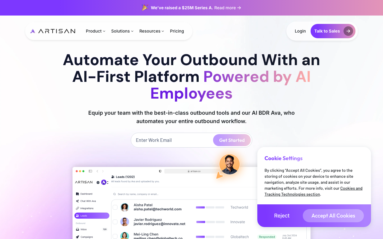 Artisan es una plataforma de empleados de IA enfocada en ventas outbound B2B. Su primer agente, Ava, actúa como una BDR virtual capaz de encontrar prospectos, investigar señales de intención, redactar secuencias de email personalizadas y ayudar a cerrar reuniones.
