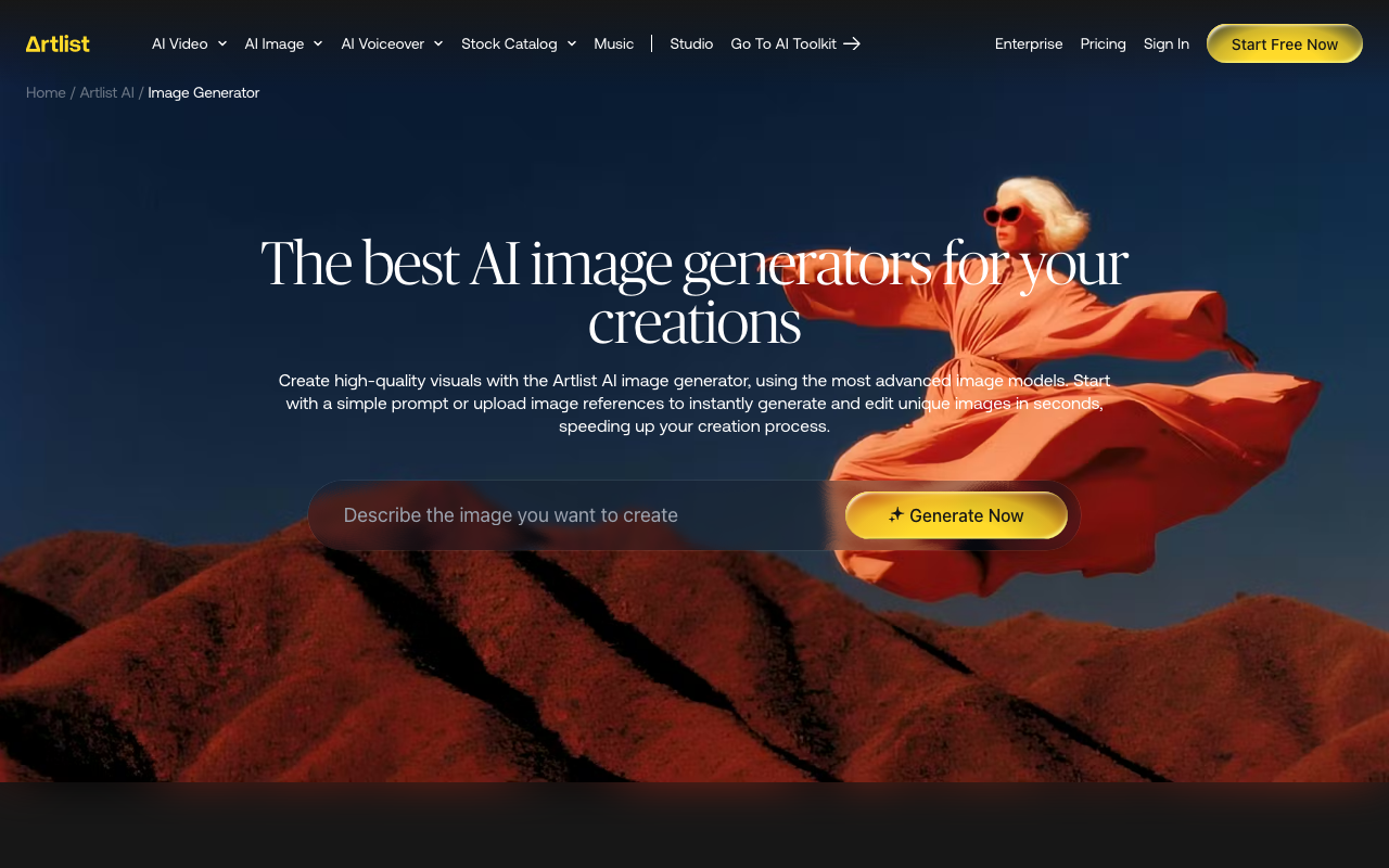 Artlist AI Image Generator es una herramienta poderosa que acelera la creación de imágenes de alta calidad, ideal para profesionales creativos y de marketing que buscan optimizar su proceso de diseño.