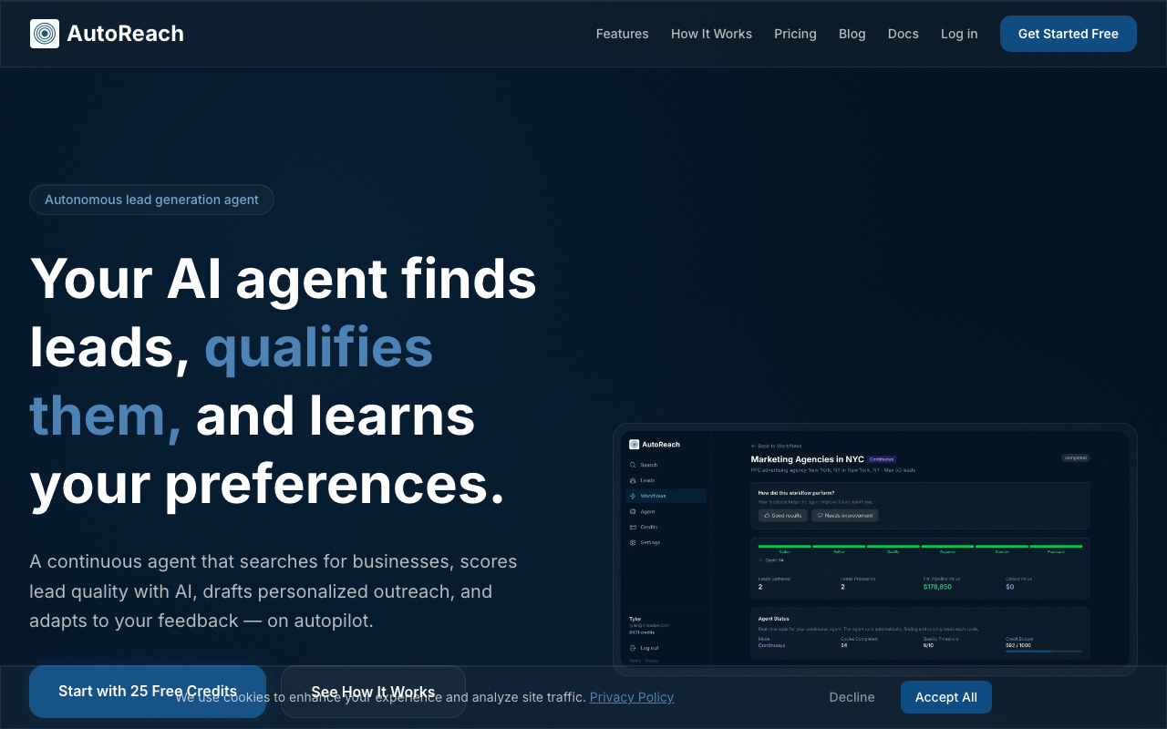 AutoReach es una herramienta de IA que genera leads de forma autónoma, califica y personaliza el outreach basándose en el feedback del usuario.
