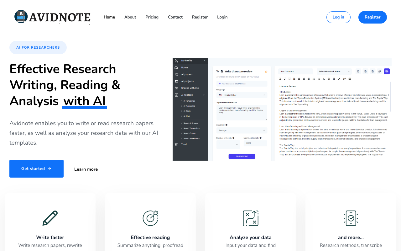 Avidnote es una plataforma de IA pensada para acelerar el trabajo académico y de investigación. Permite leer papers, redactar textos científicos, resumir contenido, corregir estilo y analizar información sin salir de un mismo entorno.