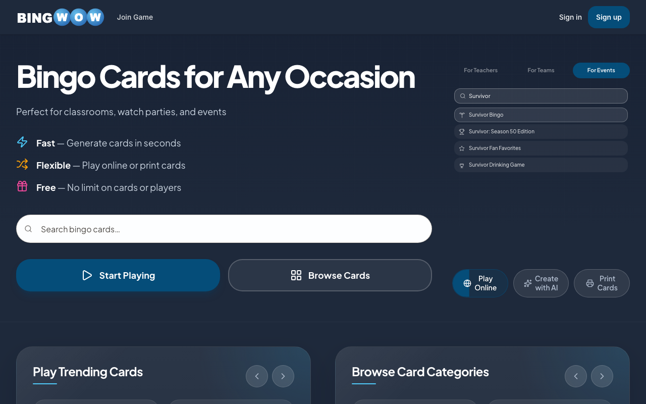 BingWow es un generador de cartones de bingo pensado para jugar en línea o imprimir, con partidas multijugador en tiempo real y una biblioteca amplia de plantillas ya listas. Permite crear juegos rápidos sin instalar nada ni pasar por un registro obligatorio.