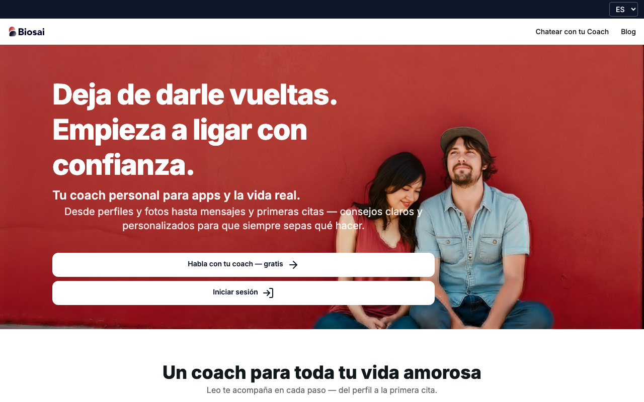 Biosai es un coach de citas impulsado por inteligencia artificial que acompaña a las personas en distintas etapas de su vida afectiva. Su enfoque combina apoyo para perfiles de apps, mensajes de conversación, primeras citas e interacción en situaciones reales.