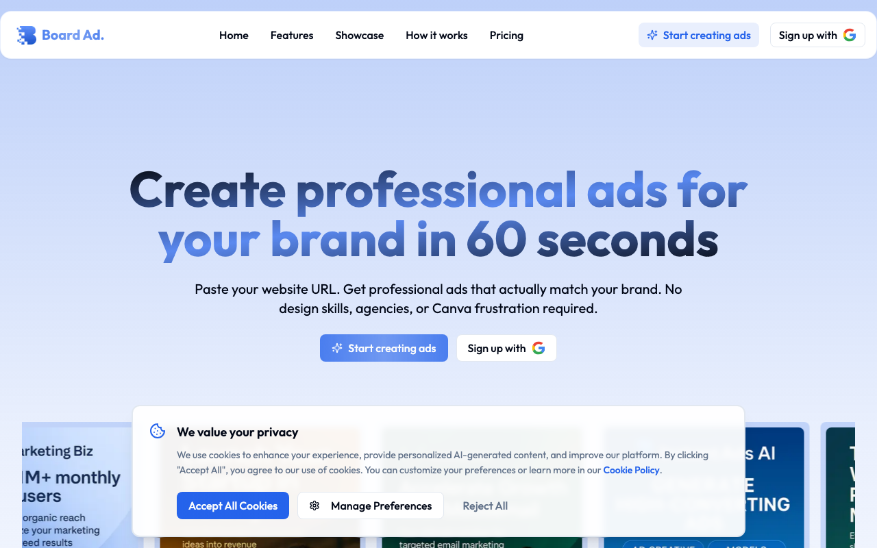 Board Ad es un estudio creativo impulsado por IA para producir piezas de marketing en minutos. A partir de la URL de tu sitio, extrae identidad de marca y genera anuncios, infografías, fotos de producto y displays 3D con un estilo visual coherente.