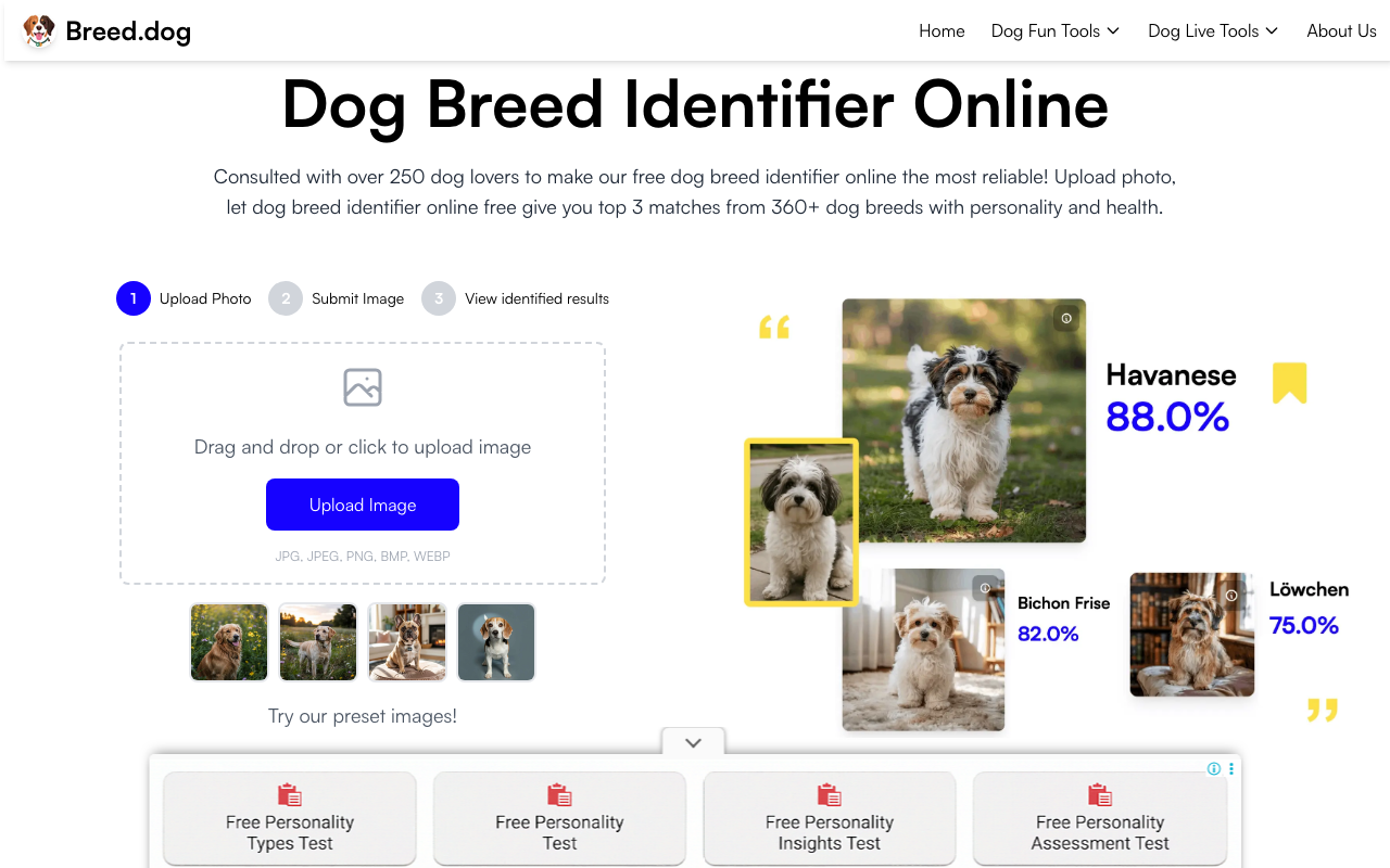 Breed.dog es un identificador de razas de perros con IA que analiza una foto subida por el usuario y compara la imagen con una base de datos de más de 360 razas. El resultado muestra hasta tres posibles coincidencias, junto con información práctica sobre tamaño, peso, temperamento, cuidados, salud y esperanza de vida.