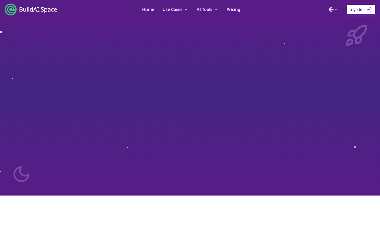BuildAI.Space es una plataforma no-code para crear aplicaciones de IA profesionales sin necesidad de programar. Está pensada para convertir una idea, conocimiento o proceso de negocio en una app funcional lista para publicar y monetizar.