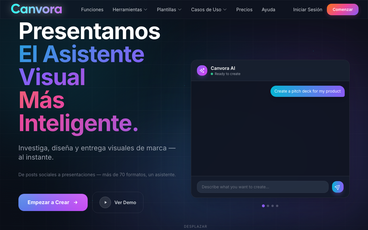 Canvora es una plataforma de contenido visual impulsada por IA que transforma ideas, documentos o temas en piezas gráficas listas para usar. Está pensada para acelerar la creación de formatos como publicaciones para redes, infografías, presentaciones, sales decks y otros recursos visuales de marketing.