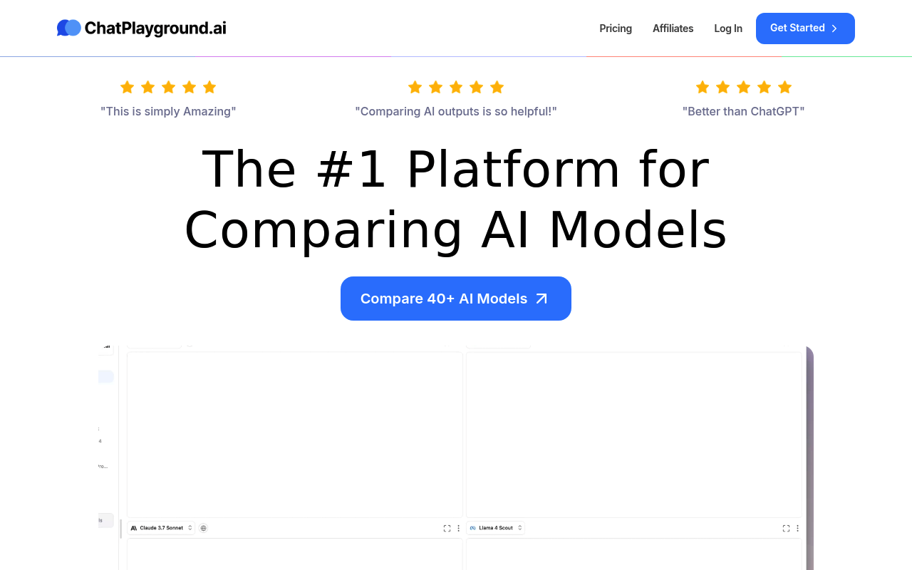 ChatPlayground AI es una plataforma unificada que permite a los usuarios acceder y comparar las respuestas de más de 40 modelos de inteligencia artificial en una sola interfaz. En lugar de cambiar entre múltiples aplicaciones de IA, los usuarios pueden ingresar un solo comando y recibir respuestas instantáneas de diferentes modelos, incluyendo ChatGPT-5, Claude 4.5 Sonnet, Gemini 2.5 Pro, Llama 4, DeepSeek, Perplexity y Grok, entre otros.