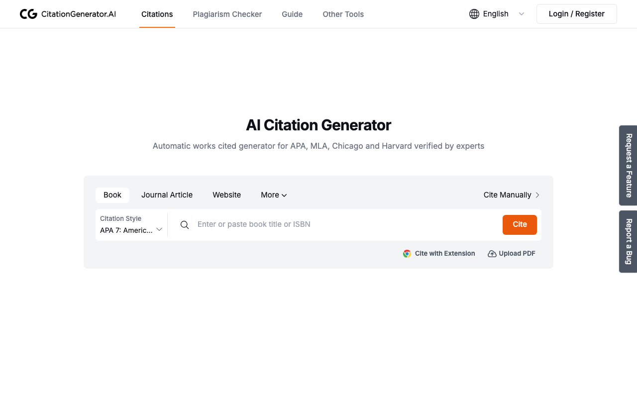 CitationGenerator.AI ayuda a crear citas y referencias bibliográficas de forma automática para trabajos académicos, artículos de investigación y documentos profesionales. Solo necesitas pegar una URL, título, ISBN o DOI para obtener una referencia lista para usar en segundos.