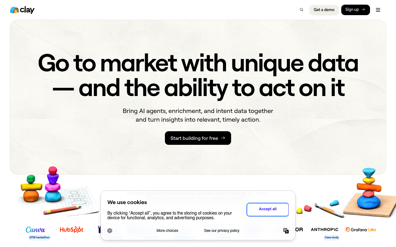 Clay permite a los equipos encontrar, enriquecer y actuar sobre datos de prospectos a gran escala. Funciona como una hoja de cálculo avanzada que se conecta a más de 150 proveedores de datos, permitiendo construir flujos de trabajo automatizados que limpian datos, enriquecen registros y activan acciones en toda la pila tecnológica.
