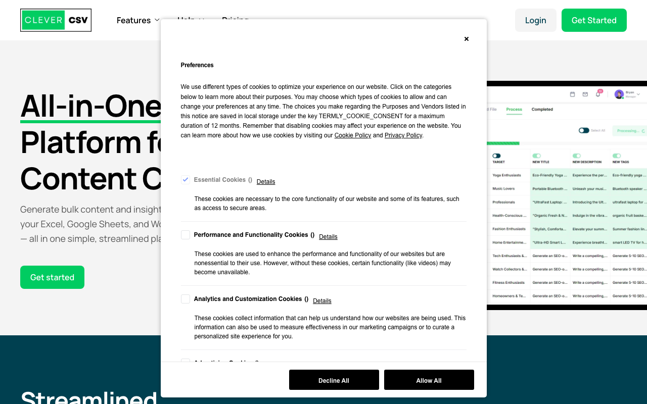 Clever CSV es una plataforma de IA para crear contenido en masa y análisis de datos inteligente, integrado con Excel, Google Sheets y WordPress.
