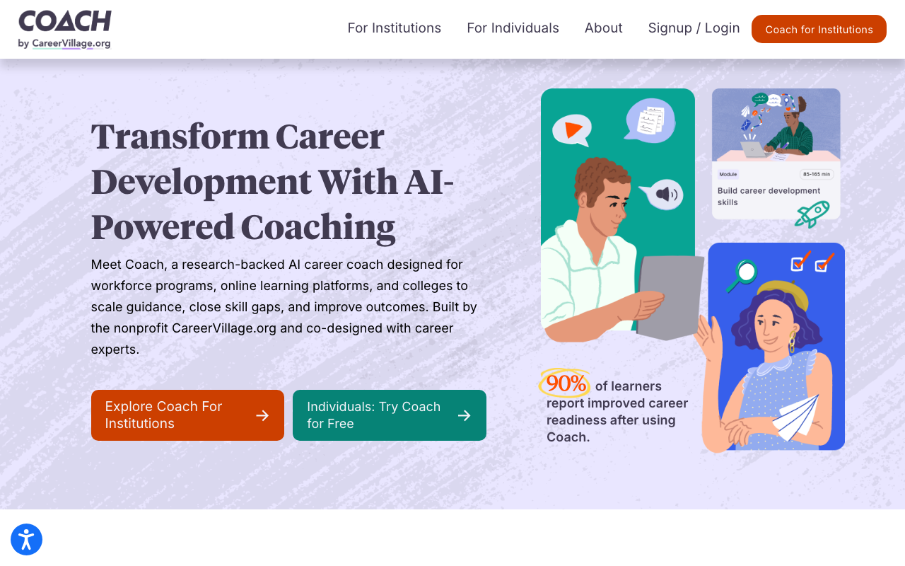 COACH es un coach de carrera con IA desarrollado por CareerVillage. Está pensado para acompañar a personas que necesitan orientación práctica para avanzar en su vida profesional, desde estudiantes hasta quienes están buscando empleo o reorientando su perfil.