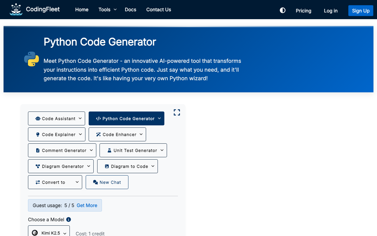 CodingFleet genera código Python preciso y de alta calidad basado en tus instrucciones, mejorando la eficiencia y productividad en el desarrollo de software.
