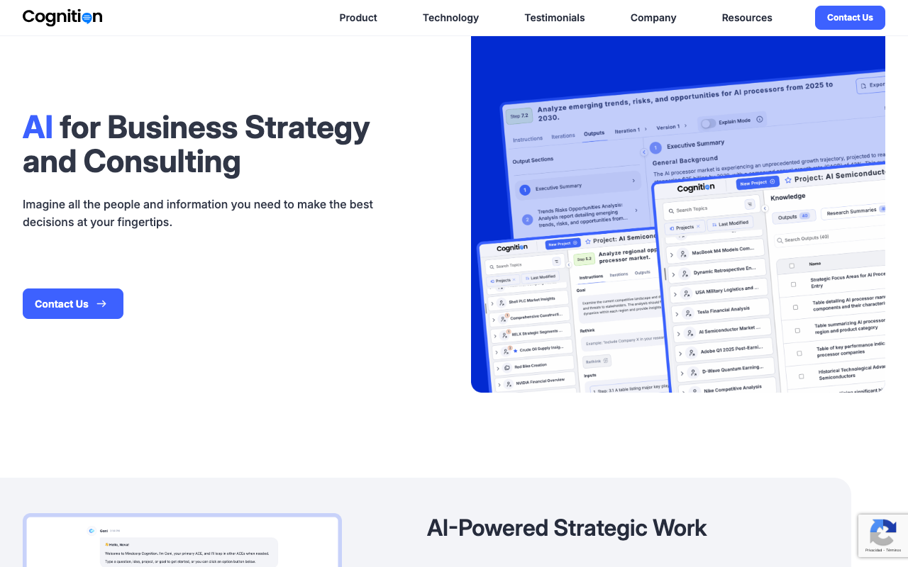 Cognition es una plataforma de IA profesional para la estrategia y toma de decisiones en grandes organizaciones, combinando expertos virtuales multidisciplinarios y automatización de flujos de trabajo