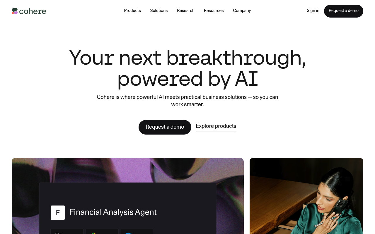 Cohere es una plataforma de inteligencia artificial empresarial que ofrece modelos de lenguaje de gran escala (LLMs) y herramientas a través de API. Está diseñada para construir aplicaciones de IA generativa seguras y personalizables, como chatbots, motores de búsqueda, resúmenes y agentes automatizados.