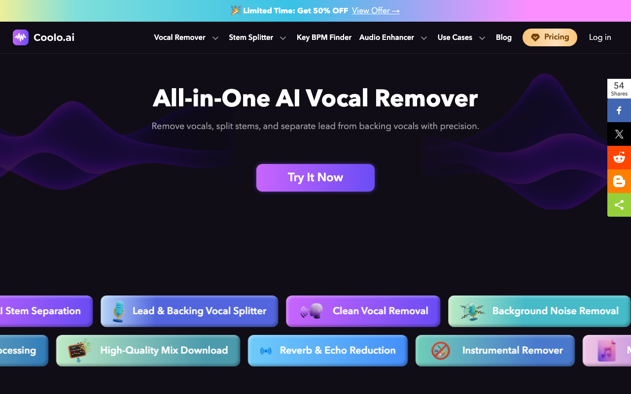 Coolo.ai reúne varias herramientas de audio con IA en una sola plataforma web. Su enfoque está en tareas prácticas de edición y análisis musical, como quitar voces, separar pistas por instrumentos y detectar el BPM y la tonalidad de una canción.