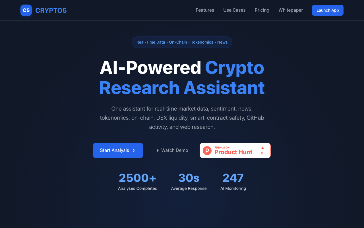 Crypto5 reúne en un solo asistente de IA la investigación cripto que normalmente obliga a saltar entre varias plataformas. Combina datos de mercado en tiempo real, sentimiento, noticias, tokenomics, métricas on-chain, liquidez en DEX, actividad de GitHub y revisión de seguridad de contratos.