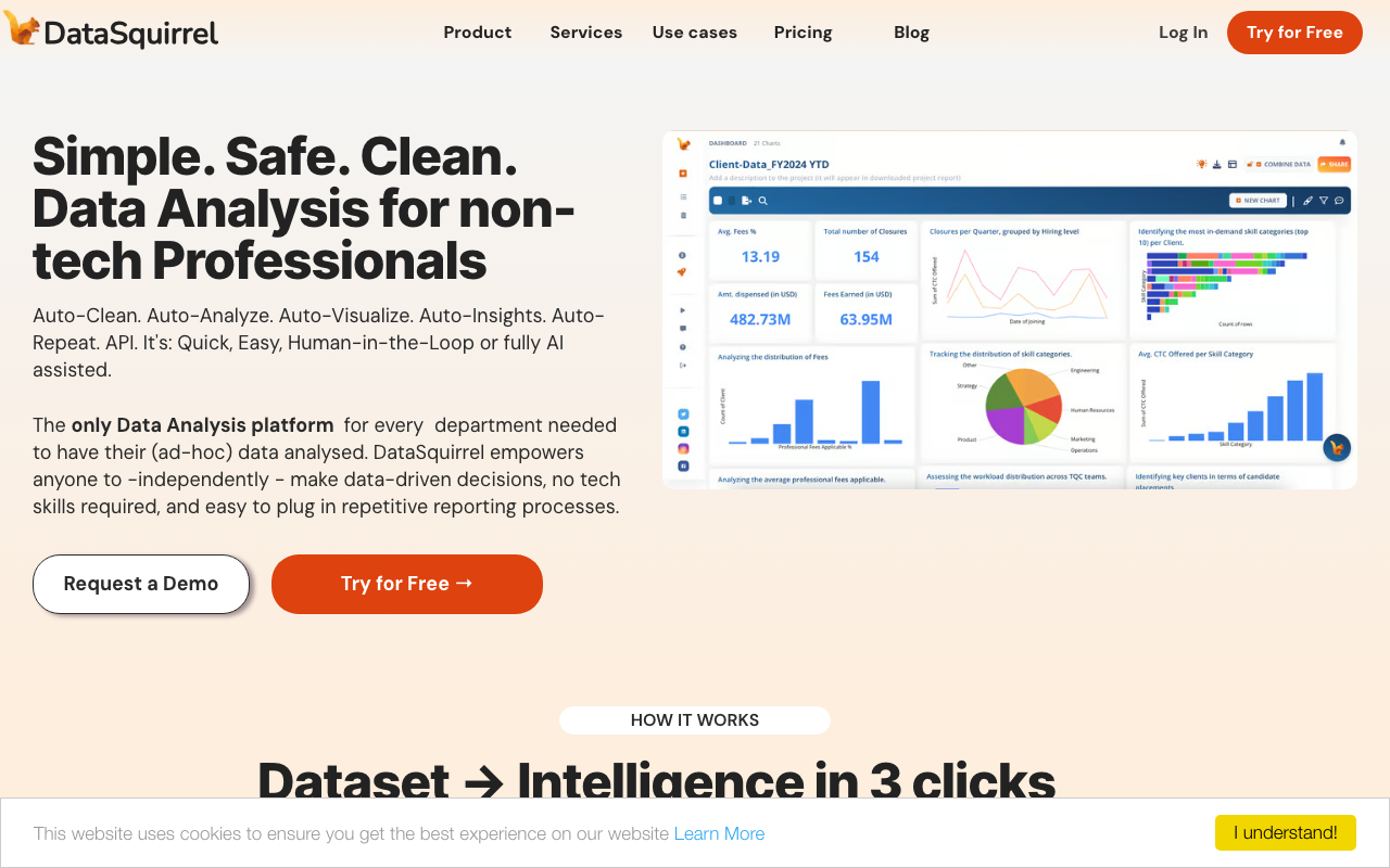 DataSquirrel es una herramienta de análisis de datos impulsada por IA que automatiza la limpieza y visualización de datos, permitiendo obtener insights rápidamente sin necesidad de fórmulas, macros o