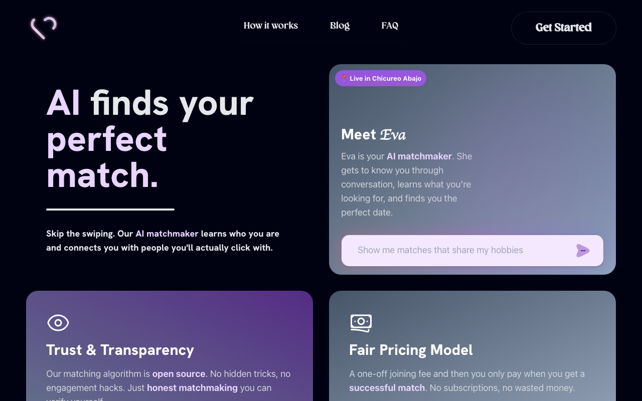 Conecta personas compatibles mediante IA para citas más humanas, sin swipes interminables y con sugerencias basadas en intereses y conversación.