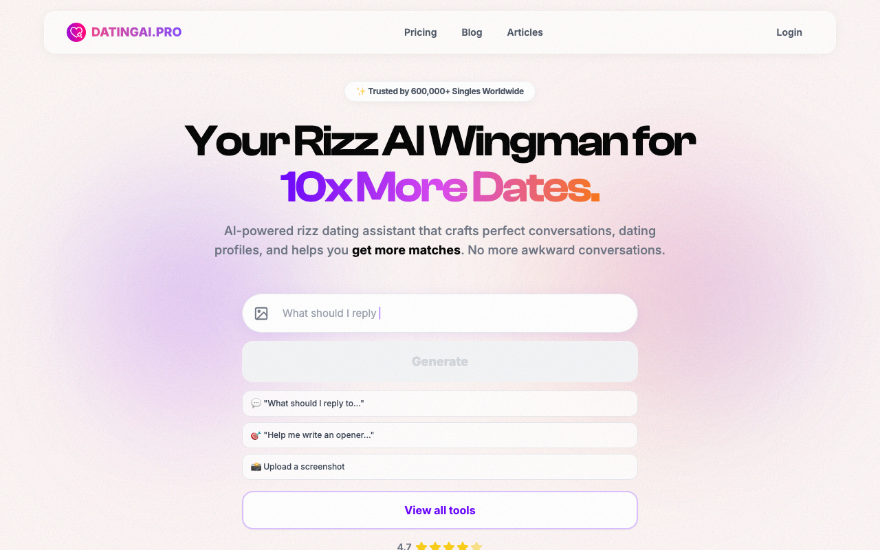 Dating AI Pro es un asistente de IA enfocado en citas online que ayuda a pulir tu presencia en apps como Tinder, Bumble o Hinge. Su propuesta gira en torno a tres frentes: mejorar el perfil, generar mejores aperturas y afinar las respuestas para que tus conversaciones avancen con más naturalidad.