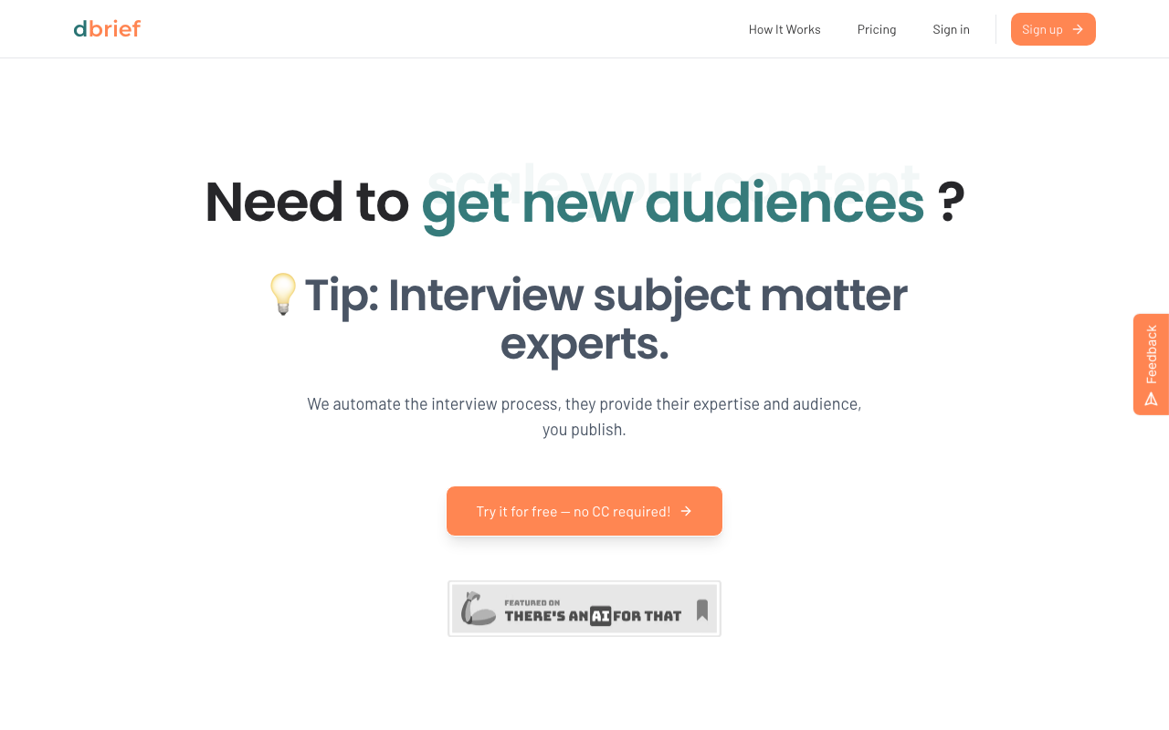 Dbrief resuelve el problema de la generación de contenido de expertos de manera rápida y eficiente. La herramienta automatiza el proceso de entrevistas, permitiendo a los usuarios escalar la producción de contenido sin sacrificar la calidad. Además, dbrief permite a los usuarios editar y publicar el contenido generado en múltiples plataformas.