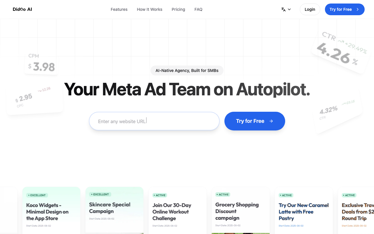 Didoo AI funciona como un media buyer con IA enfocado en Meta Ads. Aprende sobre tu negocio, analiza tus datos y toma decisiones para crear, ajustar y optimizar campañas con menos fricción operativa.