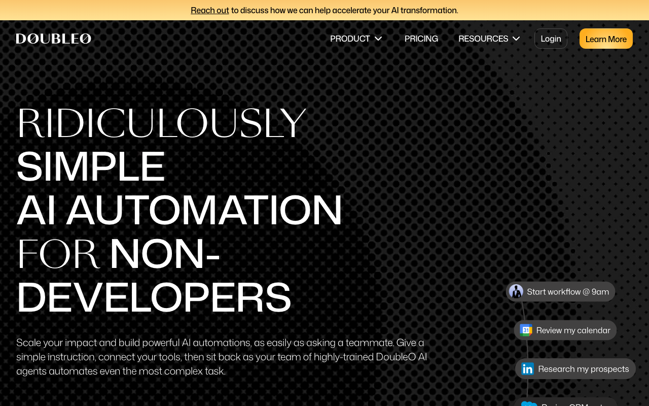 DoubleO es una herramienta de automatización de IA diseñada para no desarrolladores, que permite crear automatizaciones poderosas con instrucciones simples.