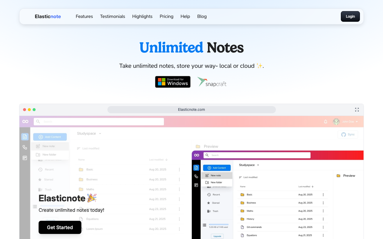 Elasticnote es una aplicación web centrada en la privacidad que permite tomar notas ilimitadas. Ofrece la posibilidad de almacenar notas localmente en tu computadora o en la nube de Elasticnote. Además, cuenta con características como un tablero de tareas, herramienta de diagramas y un editor estilo Notion.