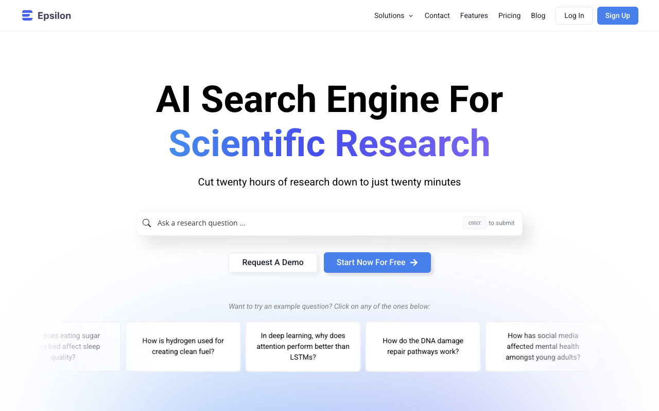 Epsilon es un motor de búsqueda con IA enfocado en investigación científica y académica. Permite hacer preguntas en lenguaje natural y obtener respuestas respaldadas con citas, resúmenes y hallazgos extraídos de literatura científica.
