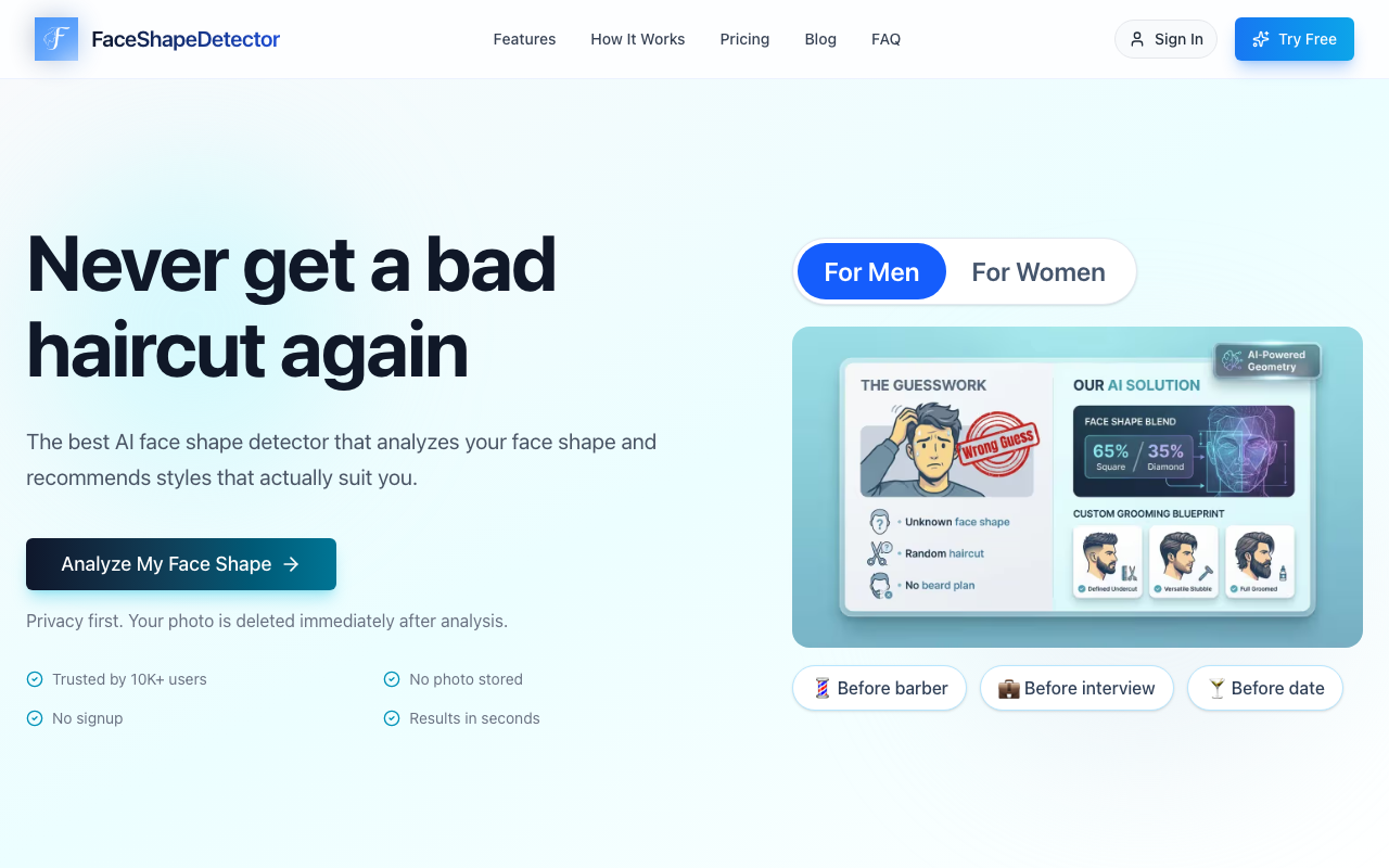 ¿Qué es FaceShapeDetector? FaceShapeDetector es una herramienta de inteligencia artificial que analiza la forma de tu rostro y te proporciona recomendaciones de cortes de pelo personalizadas.