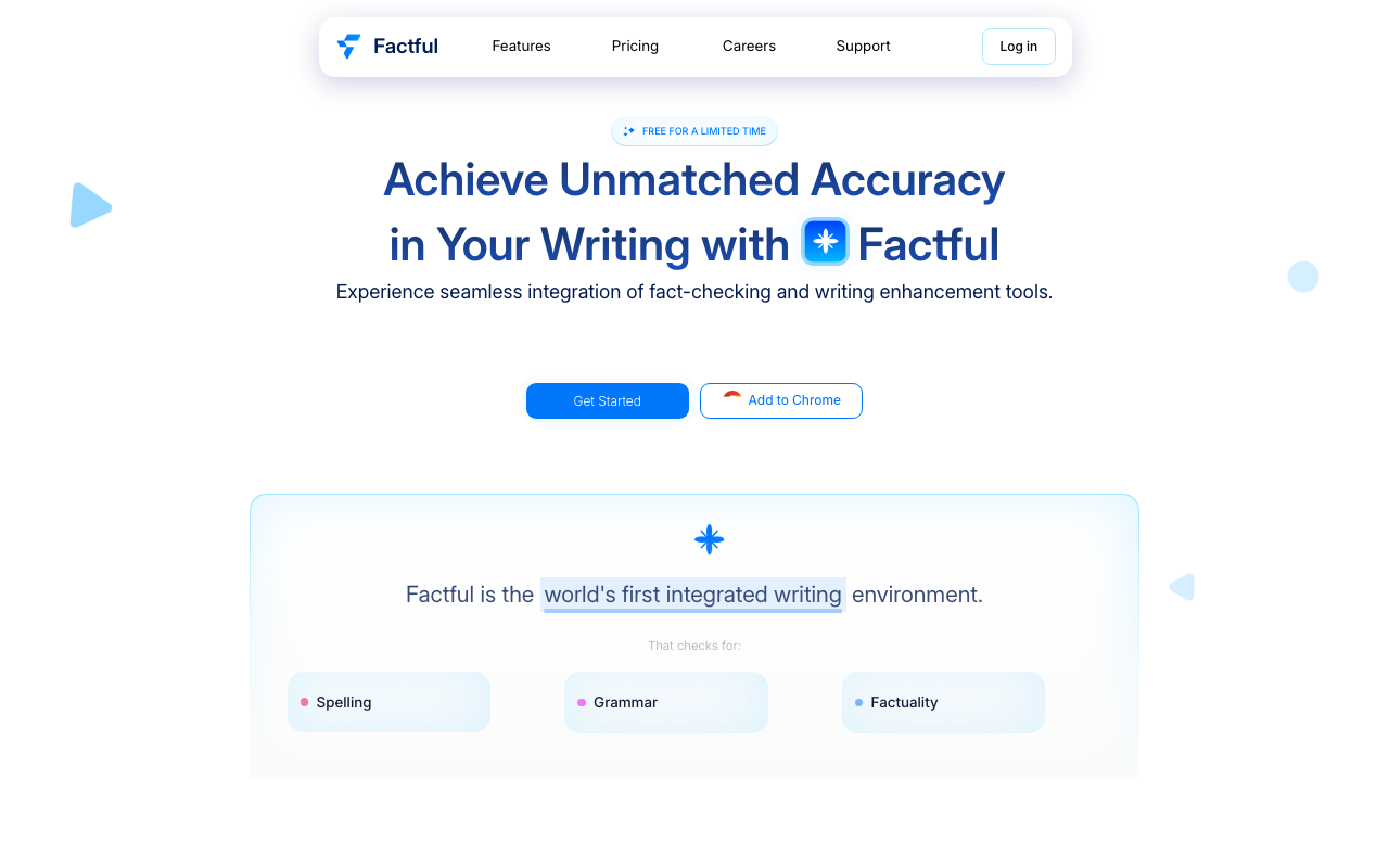Factful es una plataforma de IA enfocada en la verificación de datos y la mejora de la escritura. Su propuesta combina corrección gramatical, detección de plagio, revisión de credibilidad de fuentes y apoyo para escribir con mayor precisión.