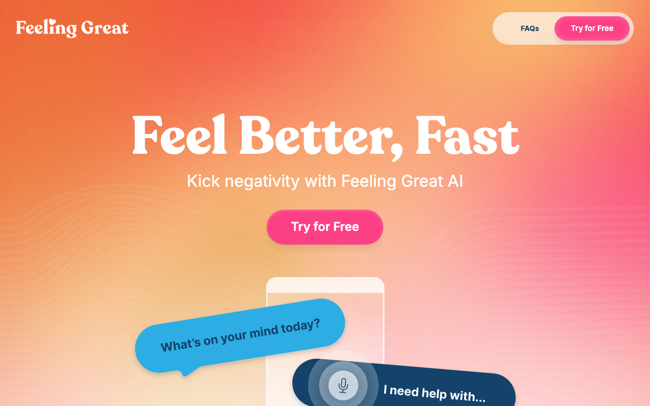 Feeling Great App es una aplicación de bienestar mental con enfoque de autoayuda, diseñada para acompañar a personas que quieren trabajar su estado de ánimo desde el celular. Combina un chatbot con un programa interactivo basado en técnicas de terapia cognitiva.