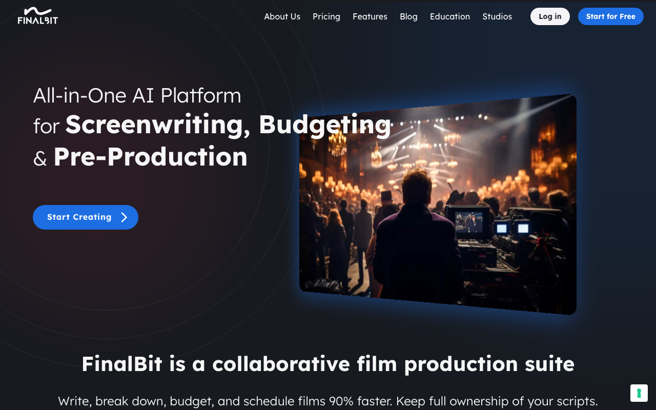 FinalBit es una plataforma AI para la creación de guiones y la producción de películas, con funcionalidades de escritura, presupuesto y planificación.