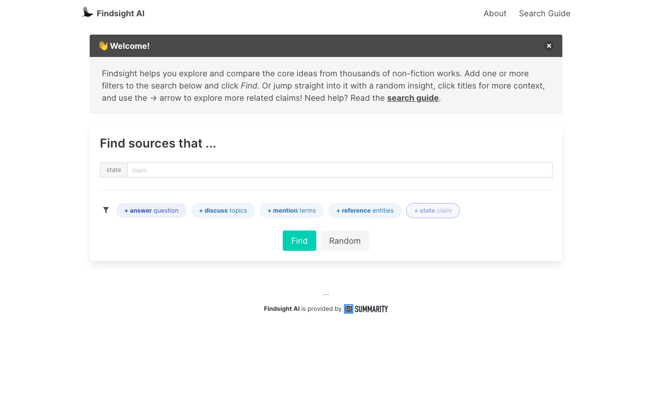 Findsight es un motor de búsqueda enfocado en no ficción que organiza el conocimiento a partir de afirmaciones, ideas y temas relacionados. En lugar de limitarse a encontrar palabras clave, te ayuda a comparar cómo distintos autores abordan un mismo tema y a seguir conexiones entre fuentes.