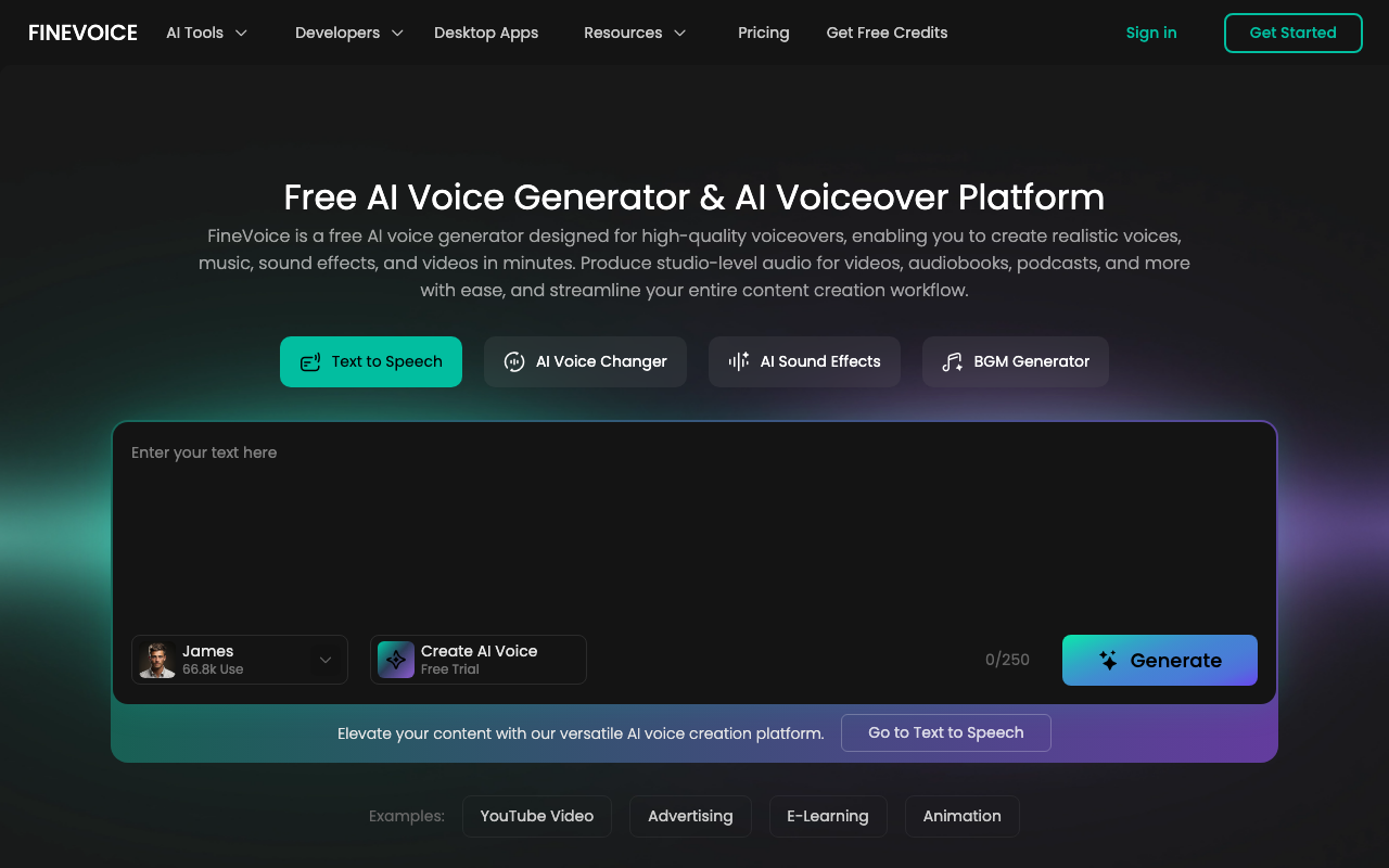 FineVoice es una plataforma de voz con IA pensada para crear audio de calidad profesional sin depender de locutores, estudios ni procesos largos de edición. Permite generar voces realistas a partir de texto, clonar voces, cambiar la voz en tiempo real y sumar efectos sonoros o música de fondo.