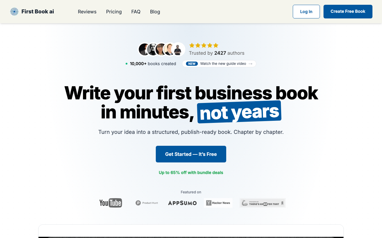 First Book AI acelera la creación de libros de negocios con un flujo guiado por IA. En lugar de empezar desde una página en blanco, la plataforma te hace preguntas, organiza tus ideas y convierte tu experiencia en un manuscrito con capítulos, secciones y formato listo para avanzar.