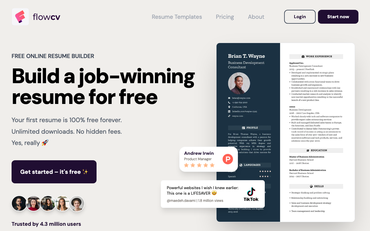 FlowCV es una plataforma web para crear currículums profesionales, cartas de presentación y materiales de marca personal sin complicaciones técnicas. Está pensada para quienes quieren postular mejor, ahorrar tiempo y presentar su experiencia con un diseño limpio y convincente.