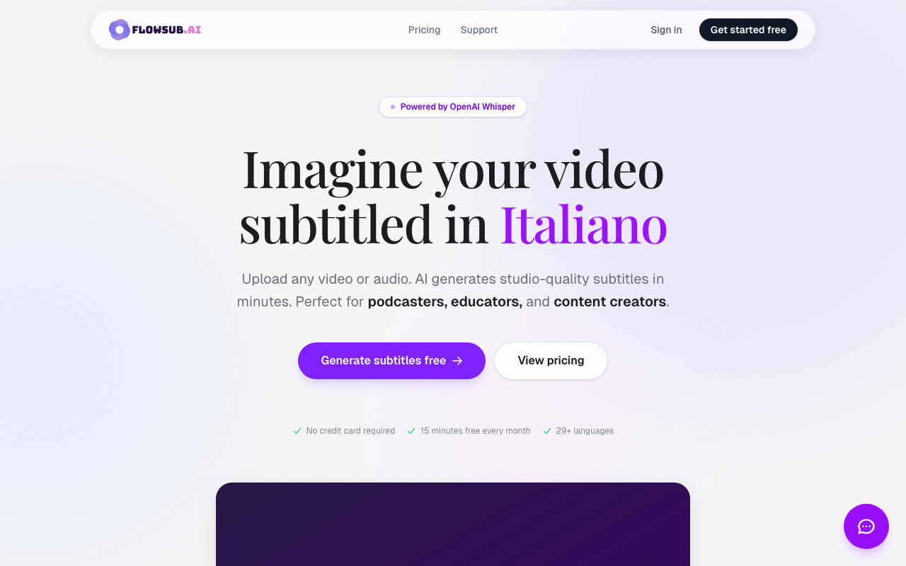 FlowSub es un generador de subtítulos con IA pensado para que conviertas cualquier archivo de video o audio en texto sincronizado, sin complicarte con herramientas de edición. Solo subes tu material, la IA transcribe el contenido y luego descargas los subtítulos en el formato que necesites.